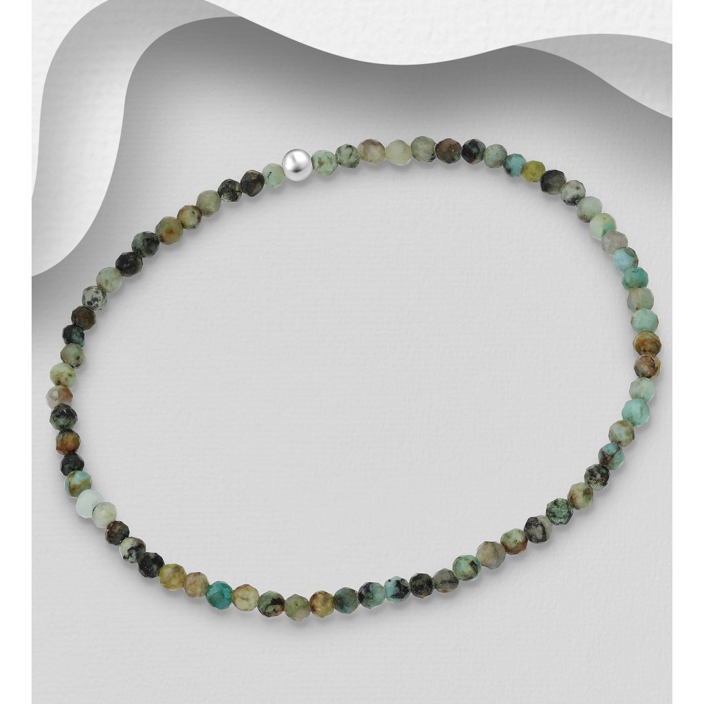 Jemný náramek z broušených kuliček afrického tyrkysu. Minerál doplňuje jedná kulička že stříbra.