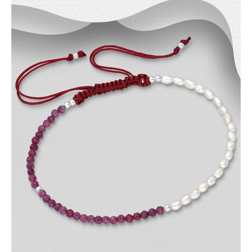 Kouzelný náramek v kombinaci drobných broušených kuliček rubínu s říčními perličkami.