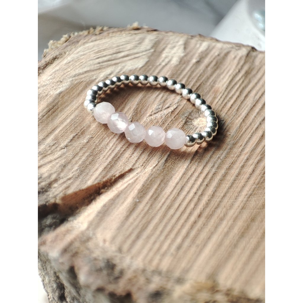 Prsten na pružné gumičce s broušenými korálky růženínu a korálky z kvalitního stříbra.