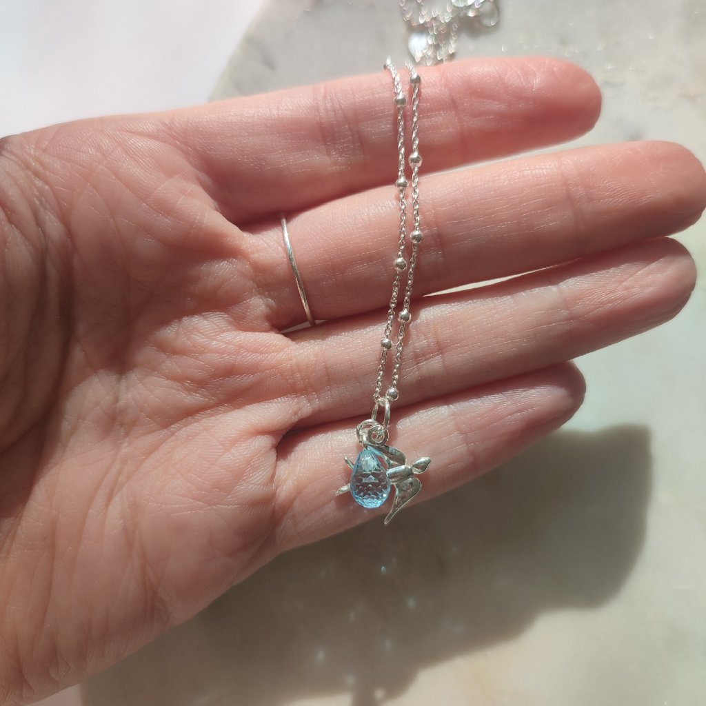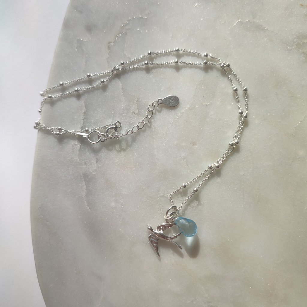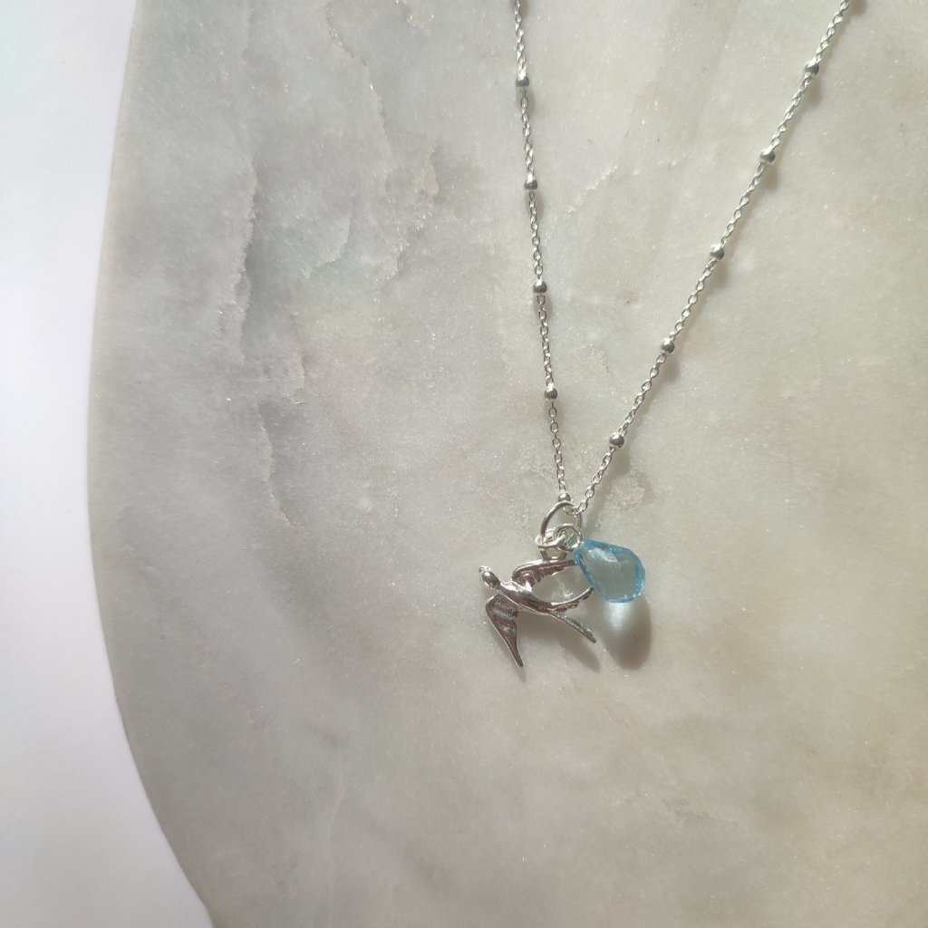 Leť si stříbrný náhrdelník s vlaštovkou a modrým topazem