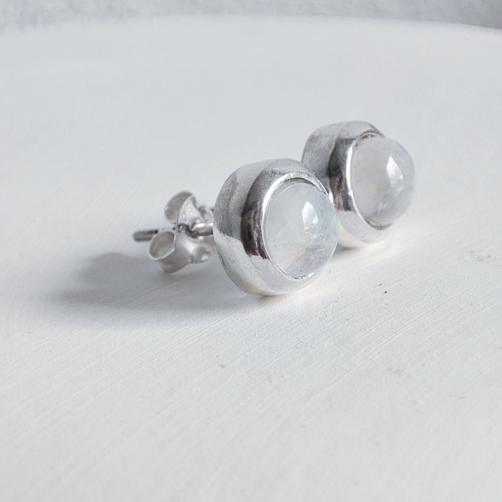 Elegantní a moderní náušnice ze stříbra s hladkými kamínky duhového měsíčního kamene.