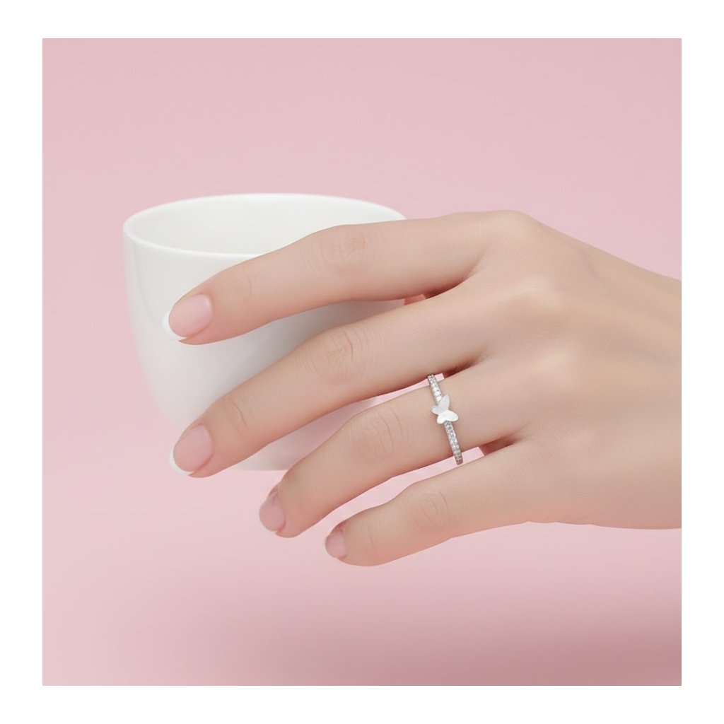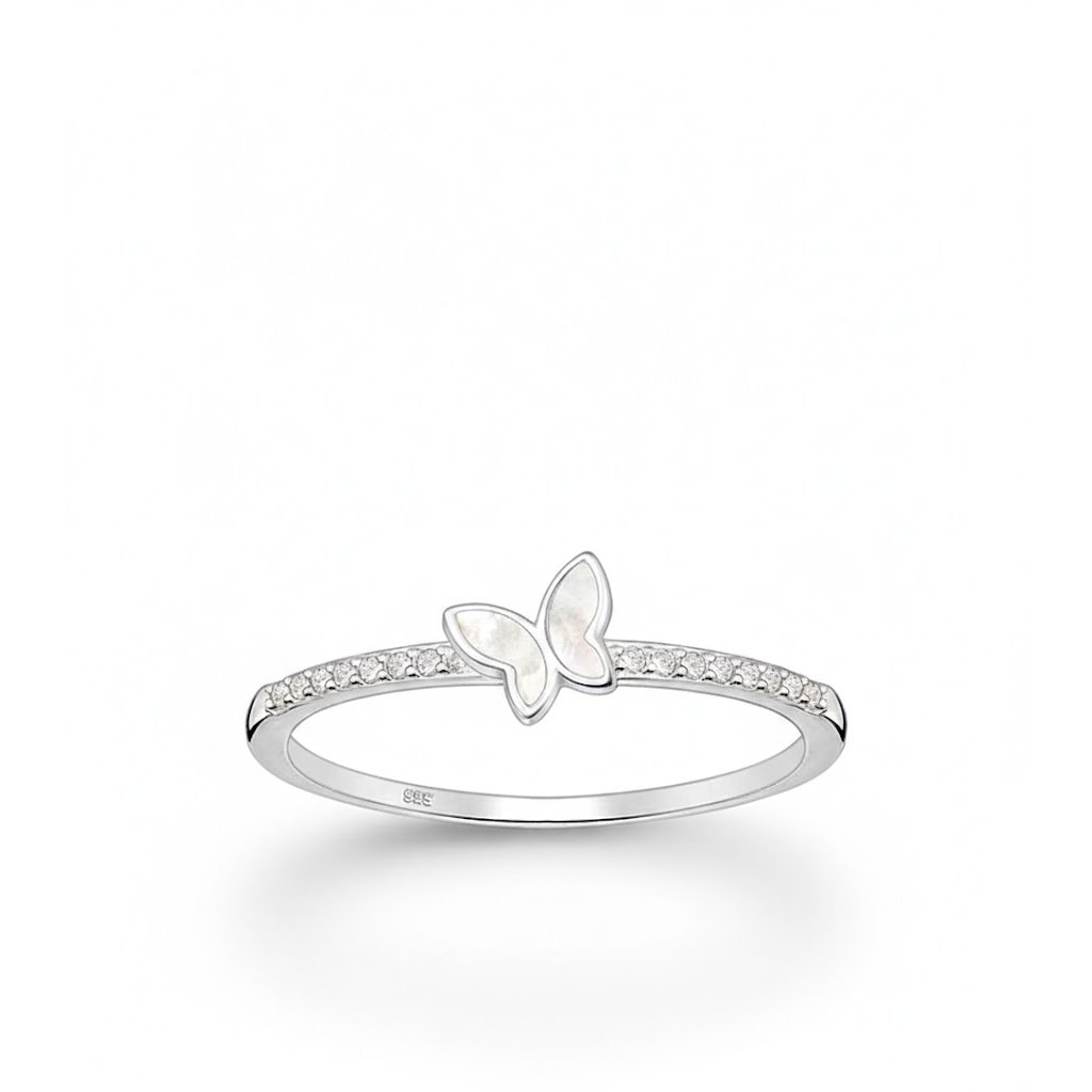 Jemně ženský stříbrný prstýnek s motivem motýlka, zdobený drobnými kubickými zirkony a bílou perletí.
