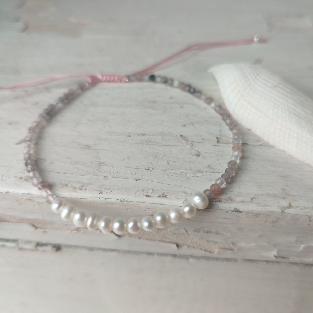 Materiál: Polyester, sladkovodní perly průměr 3 mm, přírodní fazetované kameny průměru 2mm.